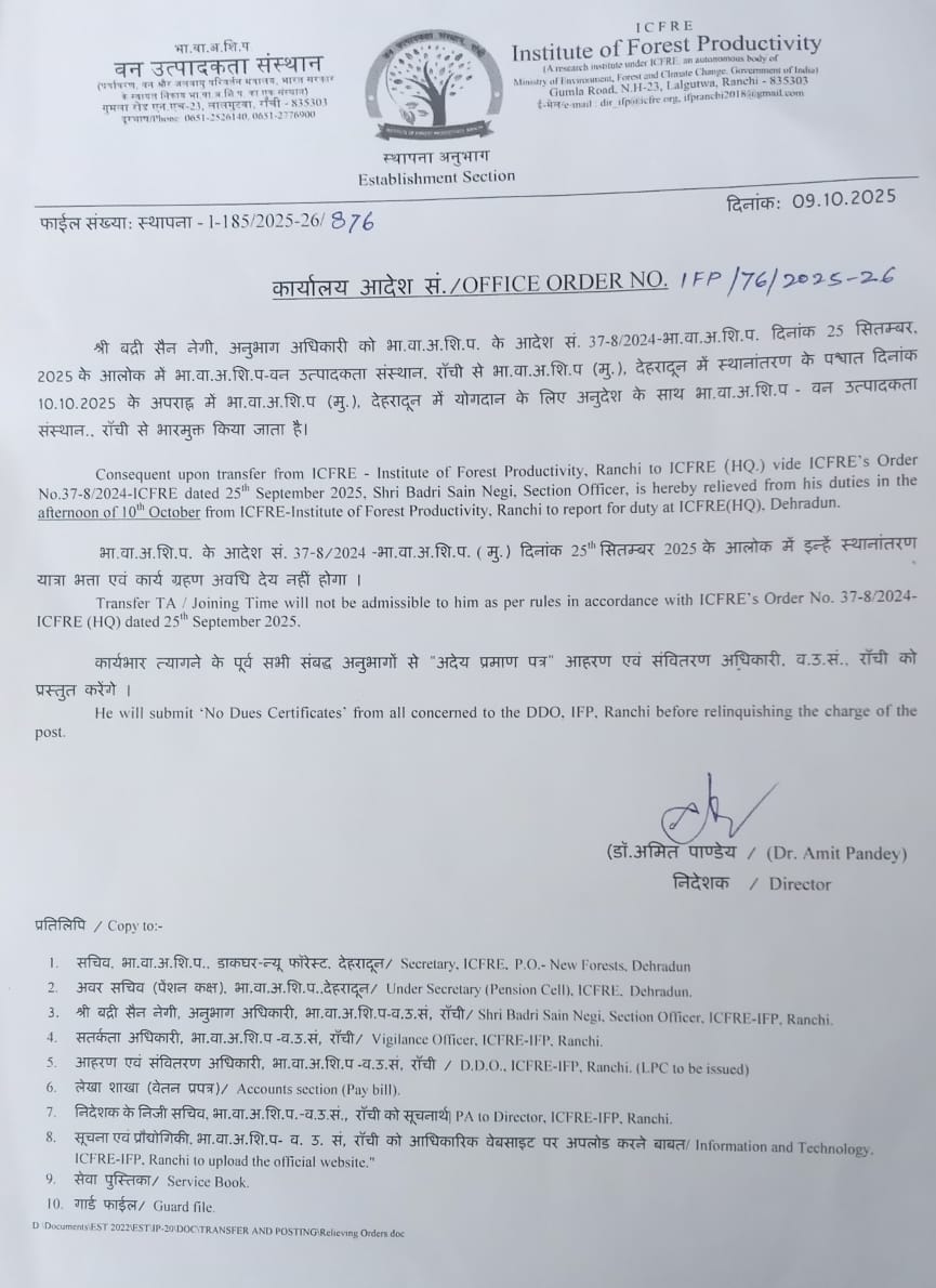 Relieving order on transfer from ICFRE-IFP, Ranchi to ICFRE (HQ) of Shri Badri Sain Negi, Section Officer. |